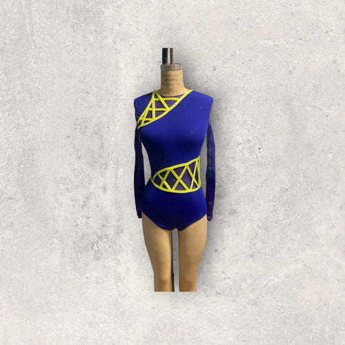 Custom Dance costume, dance competition, purple bodysuit with purple shatter glass mesh and contrast binding in neon yellow with crystals Active